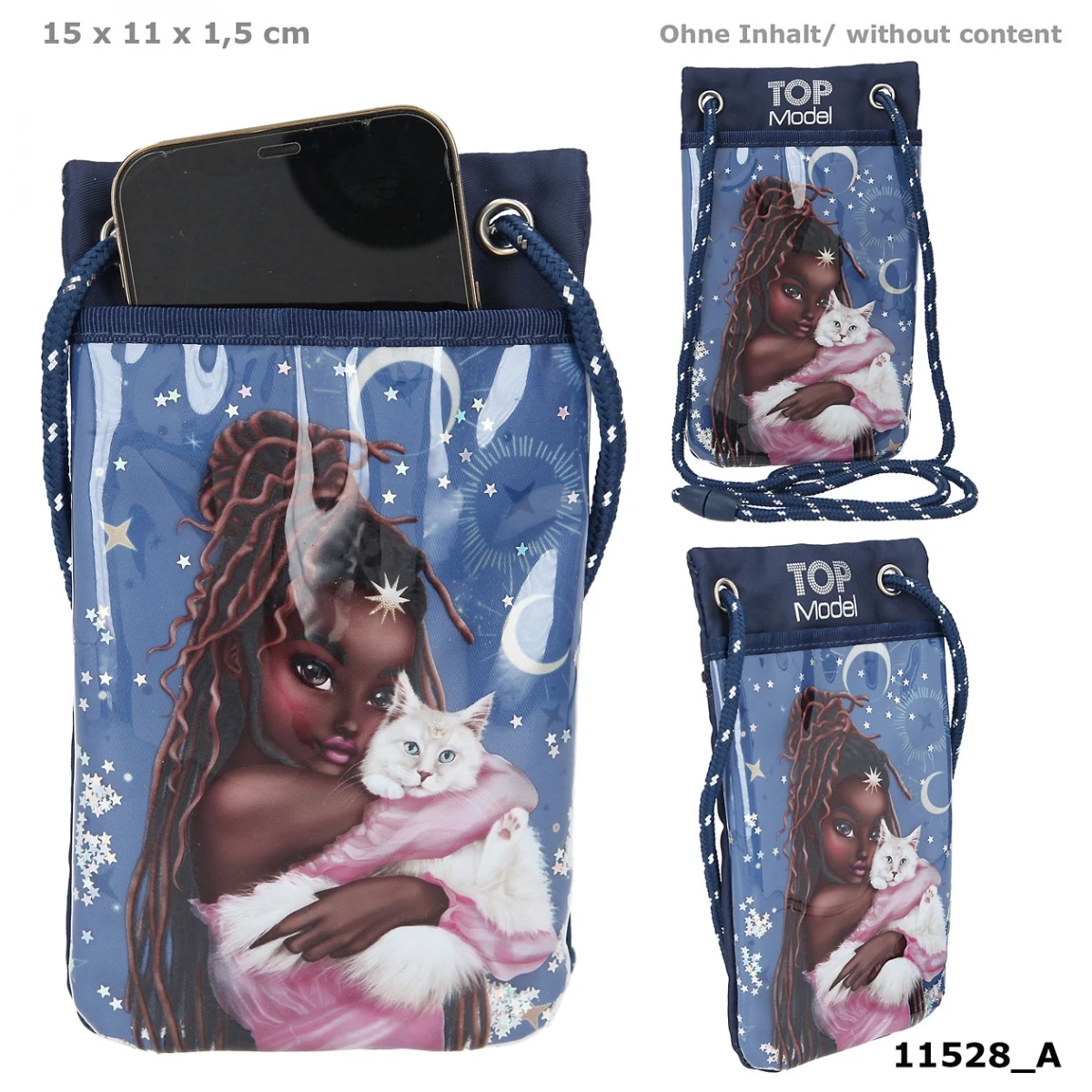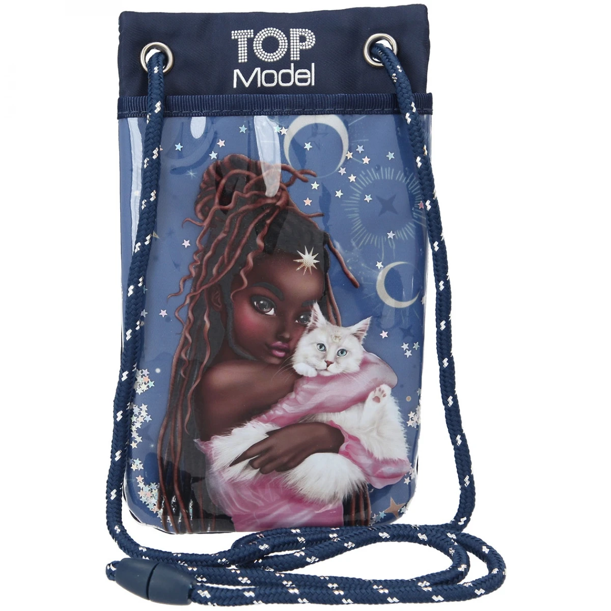 Die dunkelblaue Handytasche mit süßem Katzen-Motiv hat einen glitzernden Sternenhintergrund.